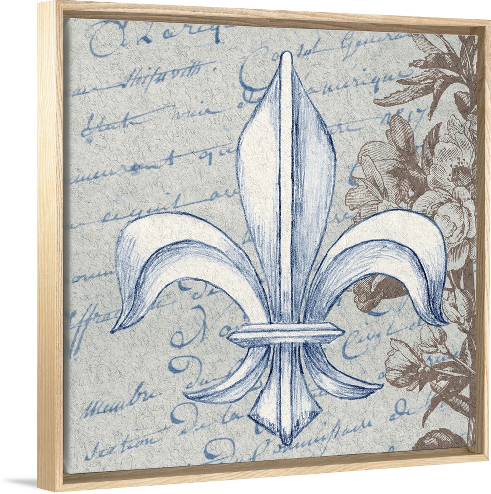 <p>Fleur de Lis design over handwritten text, with a vintage floral element.</p>