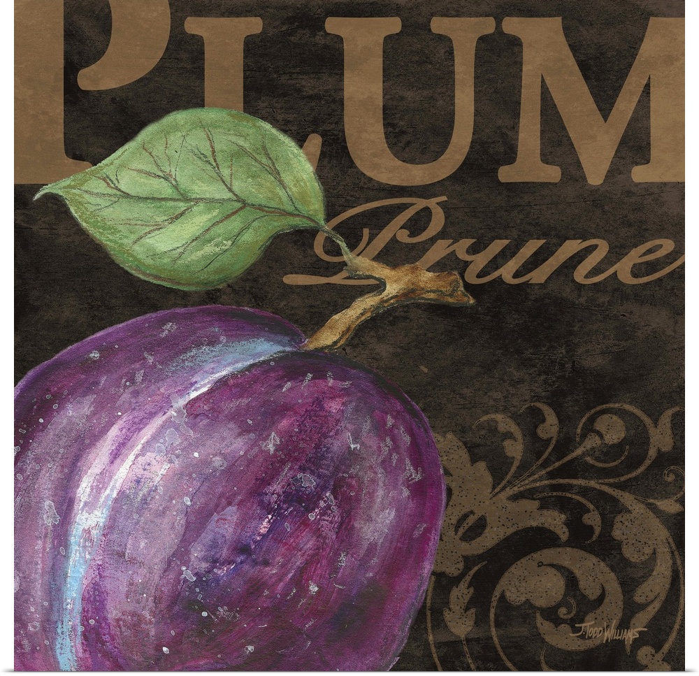 <p>Square kitchen decor with an illustration of a plum in the foreground and the word "Apple" written in copper in both English and French on a brown hued background.</p>