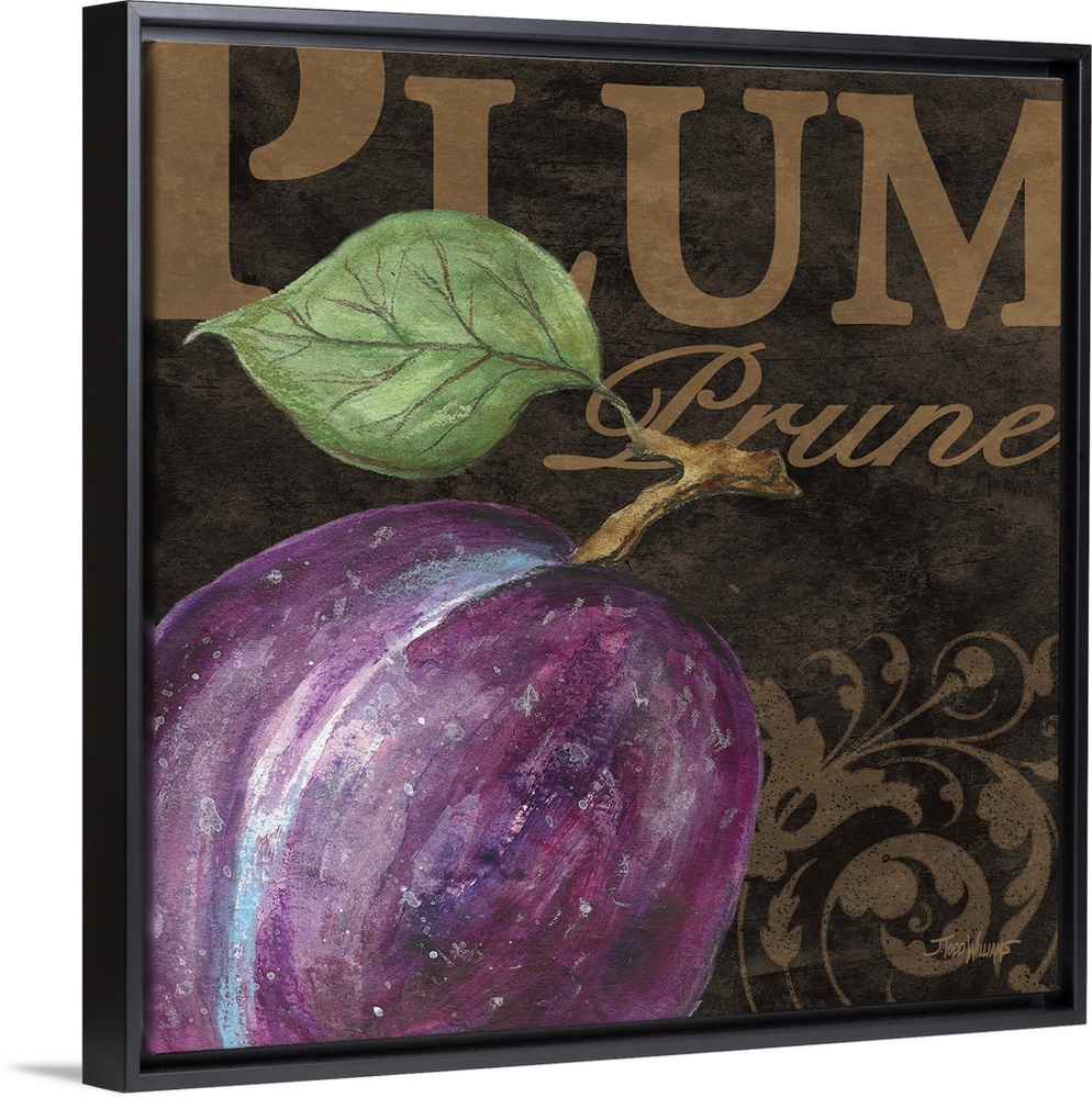 <p>Square kitchen decor with an illustration of a plum in the foreground and the word "Apple" written in copper in both English and French on a brown hued background.</p>