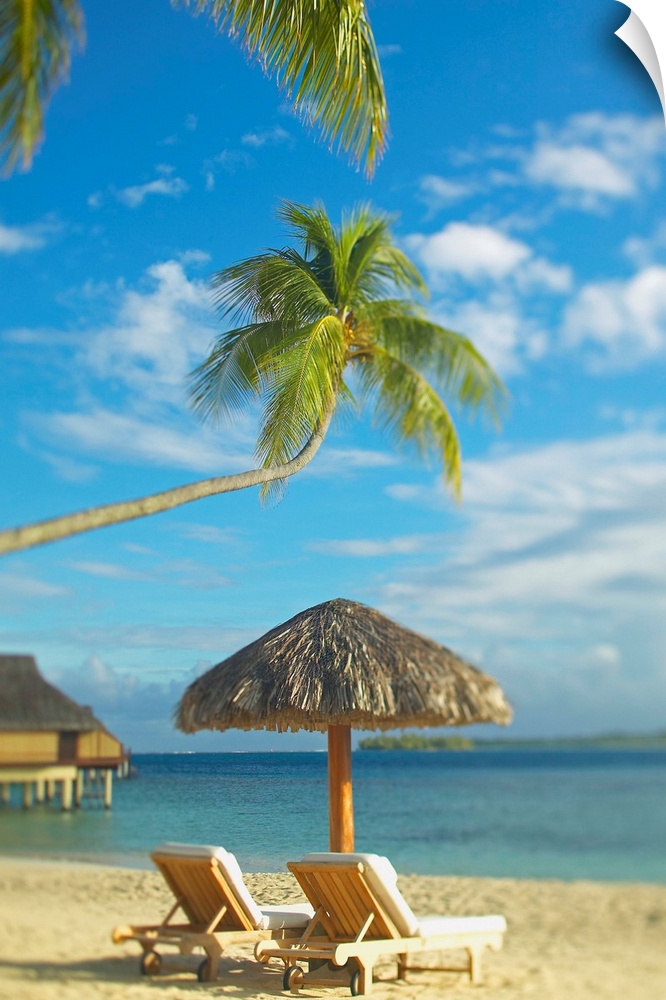 <p>Photograph taken of two beach chairs and an umbrella sitting on a beach in Tahiti. A palm tree stretches out and hangs over the chairs.</p>