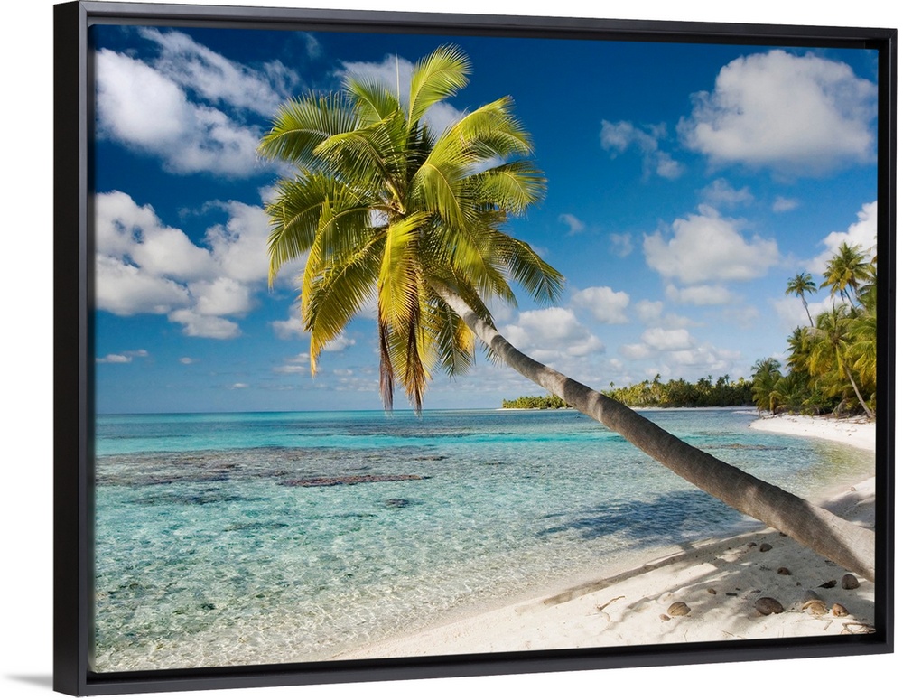 <p>A single palm tree stretches out from the beach and hangs over crystal clear water.</p>