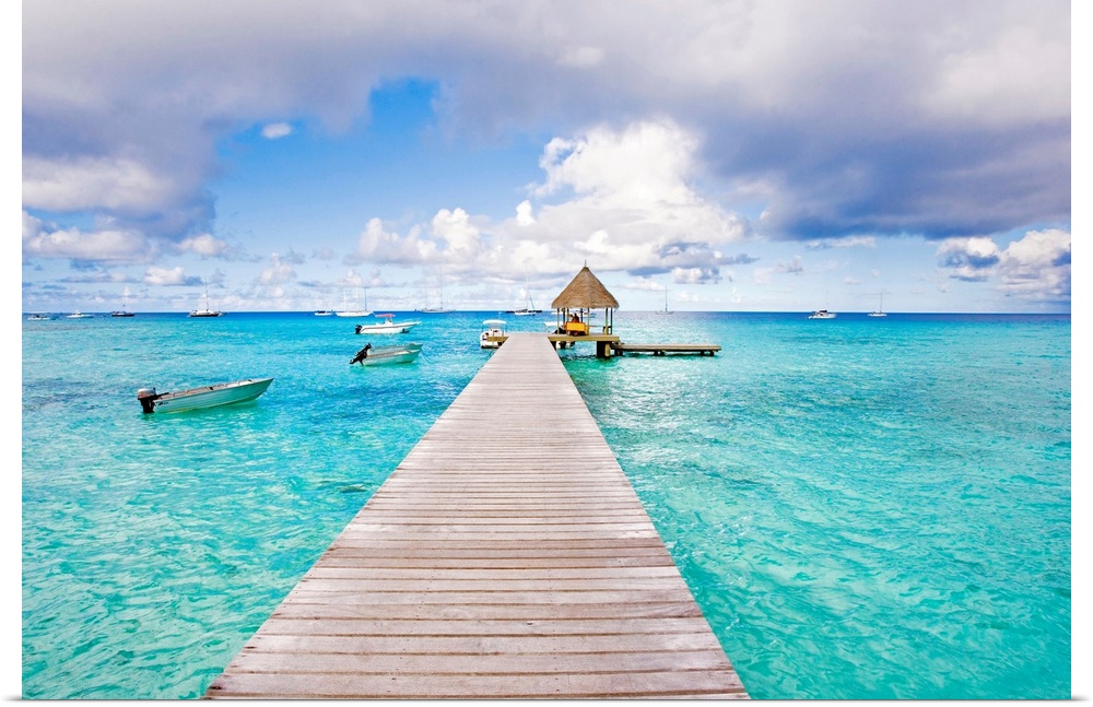 <p>Photograph taken looking down a long pier that sits over teal water and has a hut at the end.</p>
