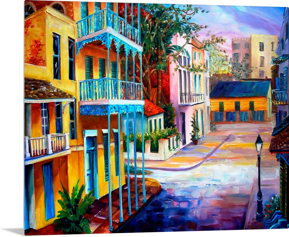 <p>Landscape painting on a large wall hanging of the sun rising over the streets of French Quarter in New Orleans, Louisiana.</p>