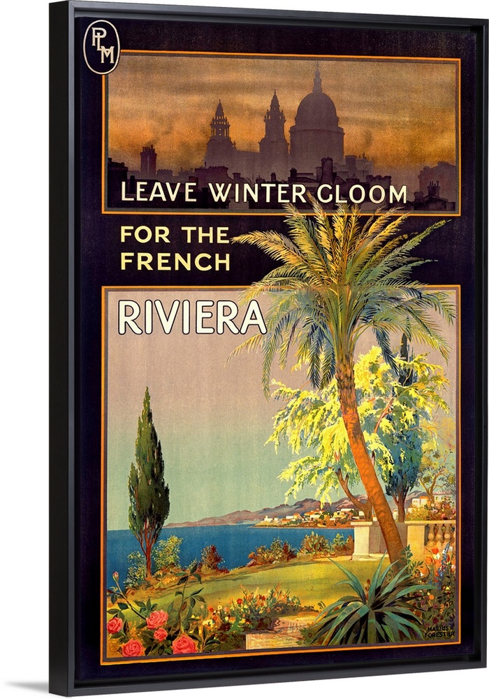 <p>This vertical travel poster contrasts a dreary and polluted city with the colorful clear air of the Mediterranean.</p>
