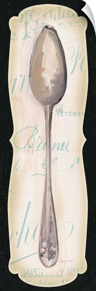 <p>Contemporary artwork of a silver spoon on a decorative text background, with a black border.</p>