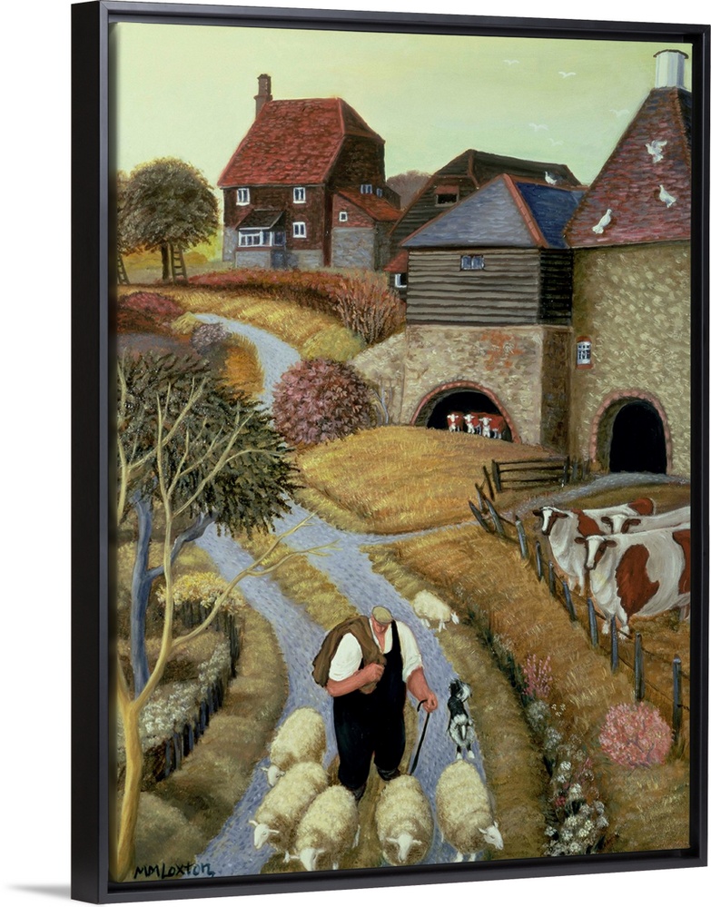 <p>Contemporary painting of a shepherd walking down a road through a city.</p>