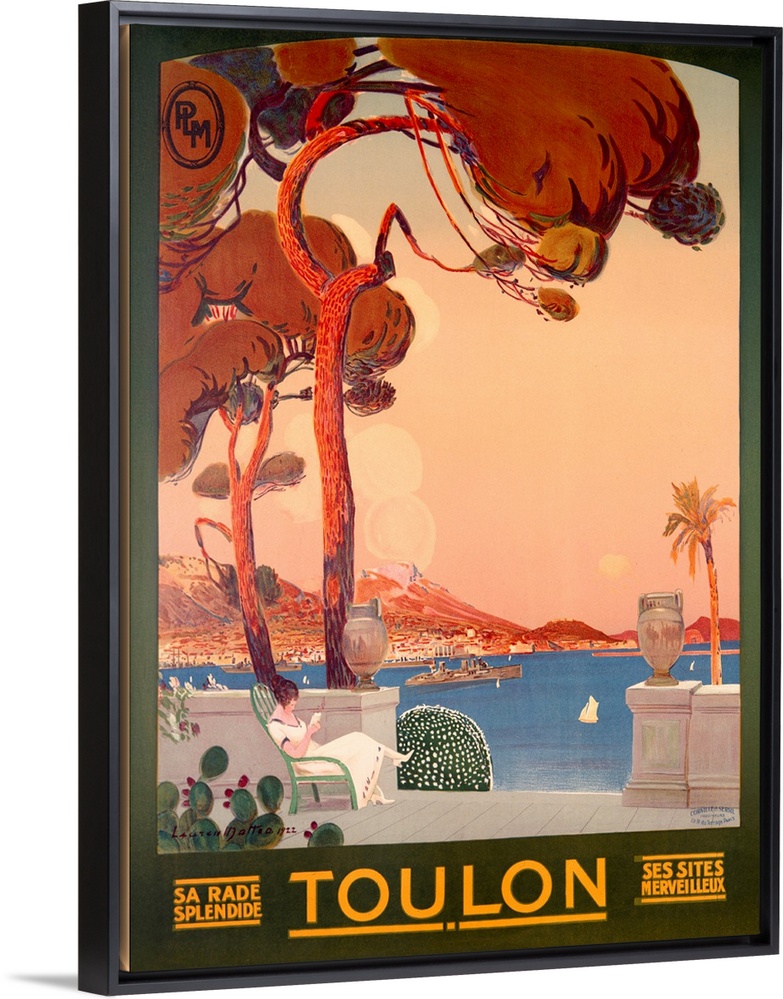 <p>1922 PLM rail poster for the French Meditteranean port of Toulon. Framed by a graceful arch, this PLM rail poster for the French Meditteranean port of Toulon praises the city for its splendid harbor and marvelous landscape. Although the image has a faint Etruscan flavor--with its urns, palmettos, upswept hairdo and burnt palette--it is dominated by a breeze-swept Cyprus tree that is rendered fashionably a la japonaise.</p>