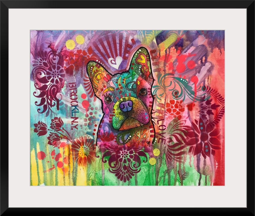 <p>Contemporary stencil painting of a french bulldog filled with various colors and patterns.</p>