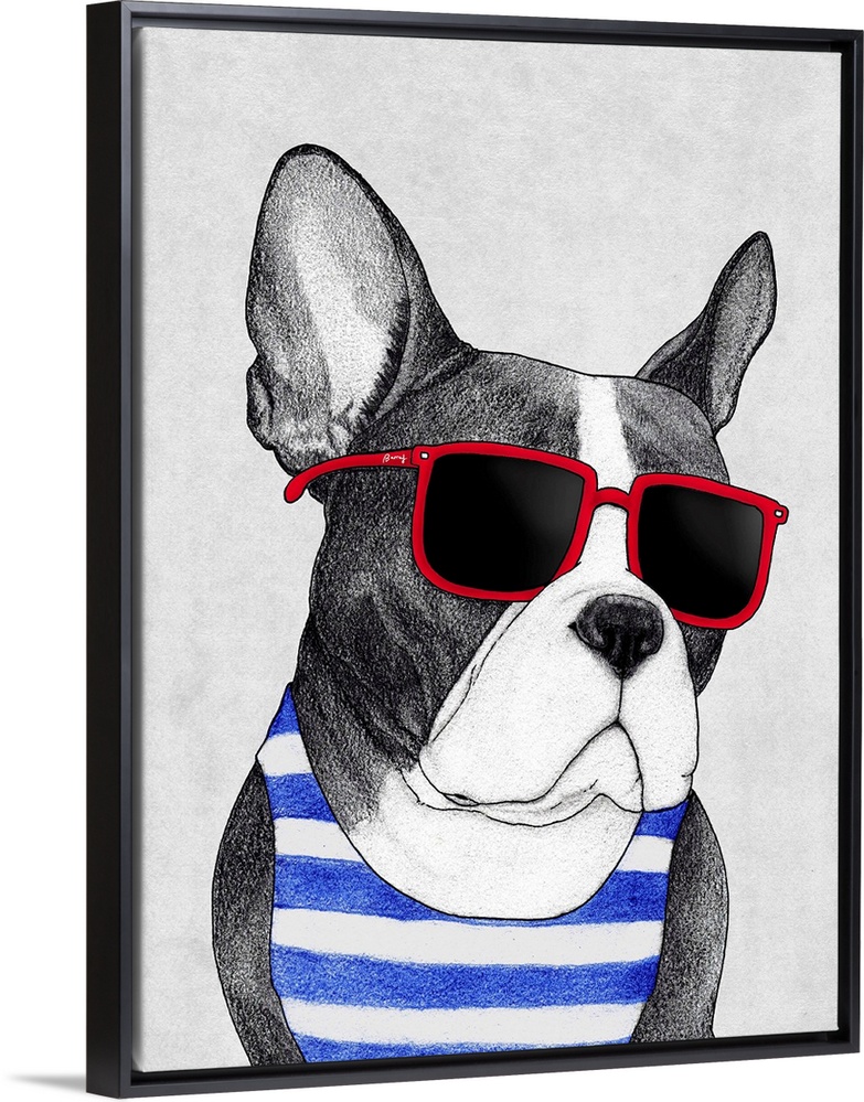 <p>A digital illustration of a french bull dog in a striped tank and red sunglasses.</p>