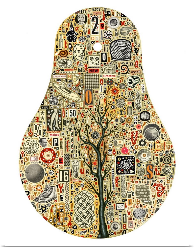 <p>Mixed media abstract art with hundreds of found elements, including text, illustrations, and symbols.</p>