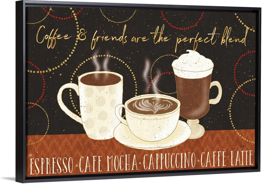 <p>"Coffee & Friends Are The Perfect Blend. Espresso, Cafe Mocha, Cappuccino, Caffe Latte" with three cups of coffee on a circle patterned backdrop.</p>