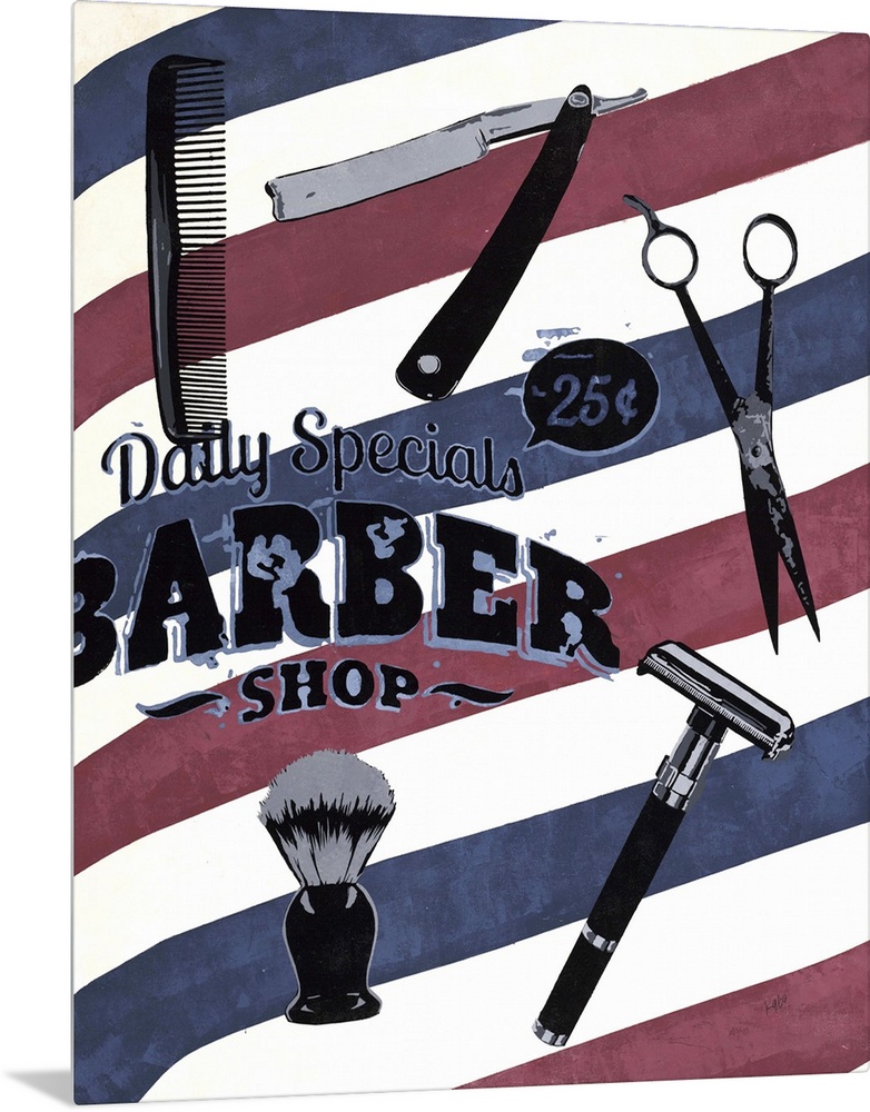 <p>A contemporary painting of a red white and blue striped barber background with hair cutter and shaving materials.</p>