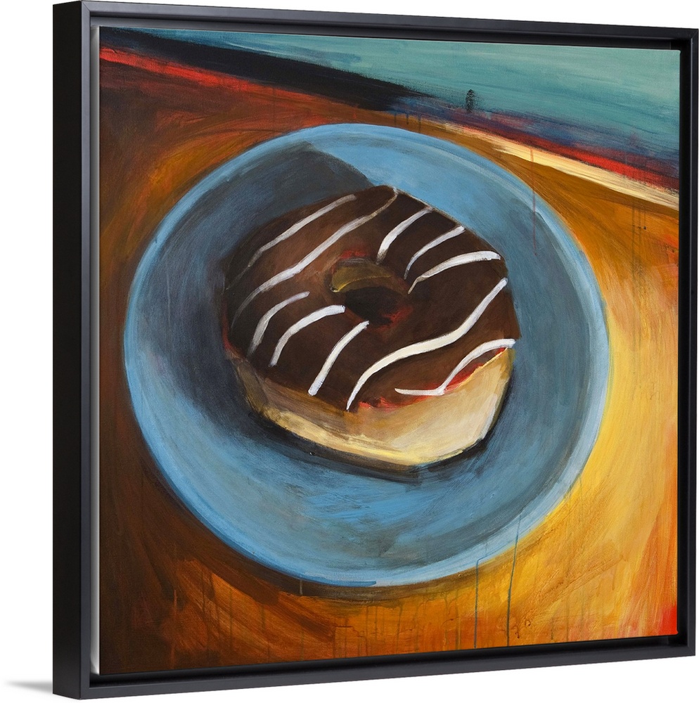 <p>Contemporary painting of a chocolate frosted donut on a blue plate.</p>