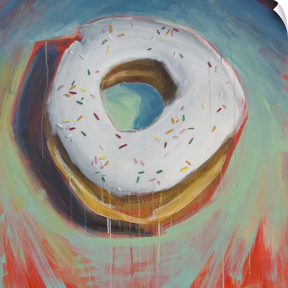 <p>Contemporary painting of a vanilla frosted donut on a blue plate.</p>