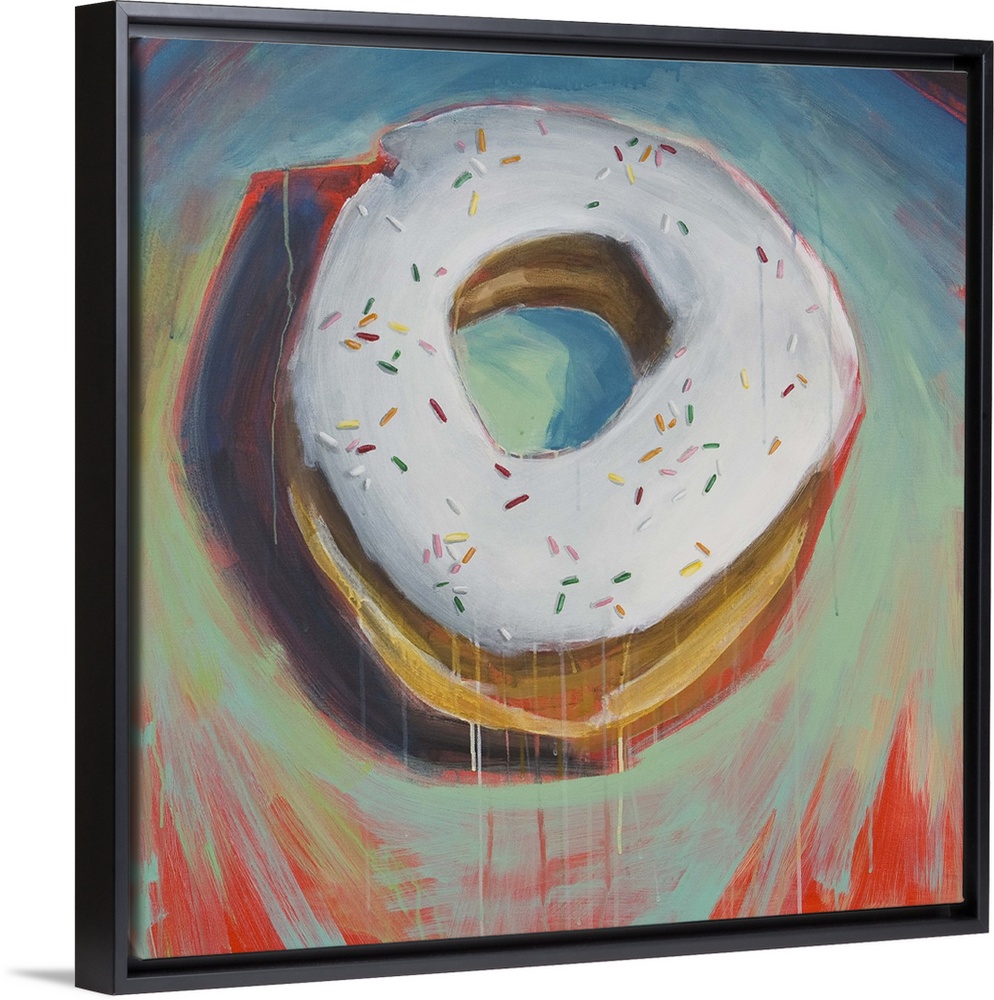<p>Contemporary painting of a vanilla frosted donut on a blue plate.</p>