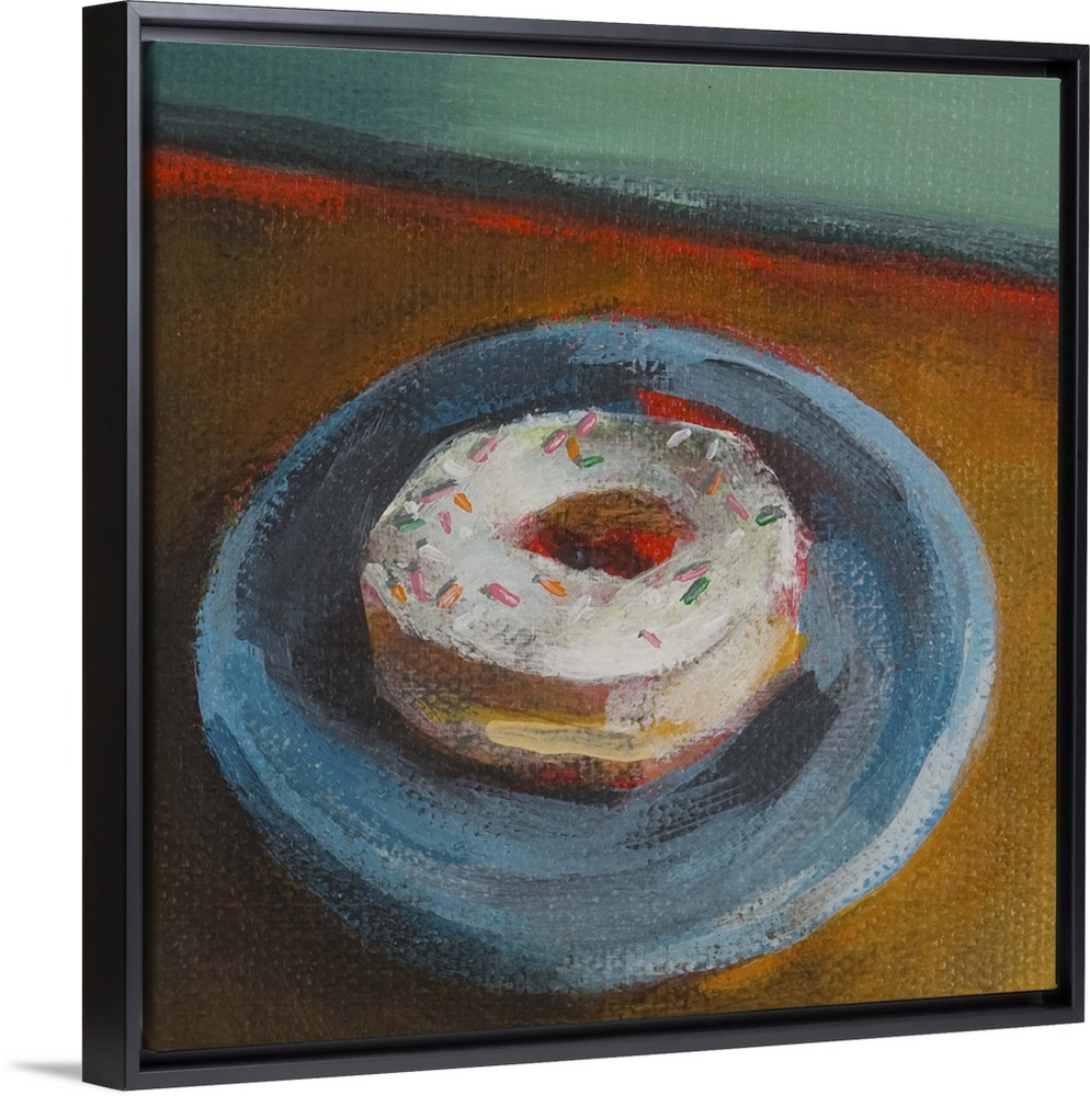 <p>Contemporary painting of a vanilla frosted donut on a blue plate.</p>