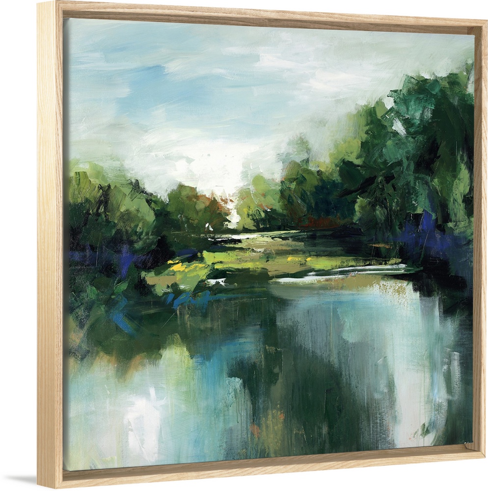 <p>Landscape painting in thick sweeping brushstrokes of a calm pond in front of a grove of lush trees and a green landscape.</p>