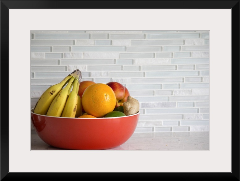 <p>Red bowl with fresh fruit on grey granite kitchen counter with glass tile backsplash.</p>