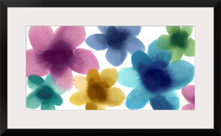 <p>Colorful translucent floral silhouettes on a bright white background.</p>