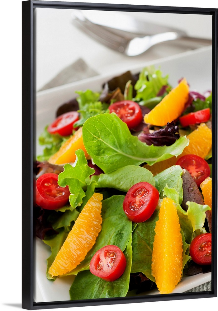 <p>Leafy greens topped with tomatoes and oranges is elegantly photographed.</p>