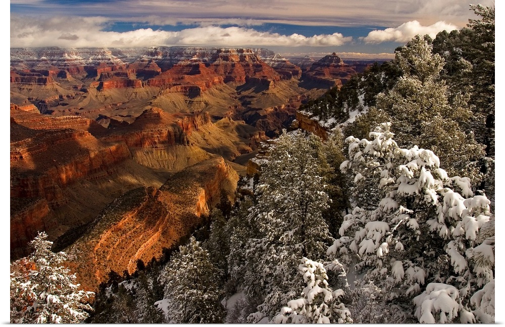 <p>From the National Geographic Collection. Photograph of snow covered forest with gorge in the distance fading into puffy white clouds.</p>