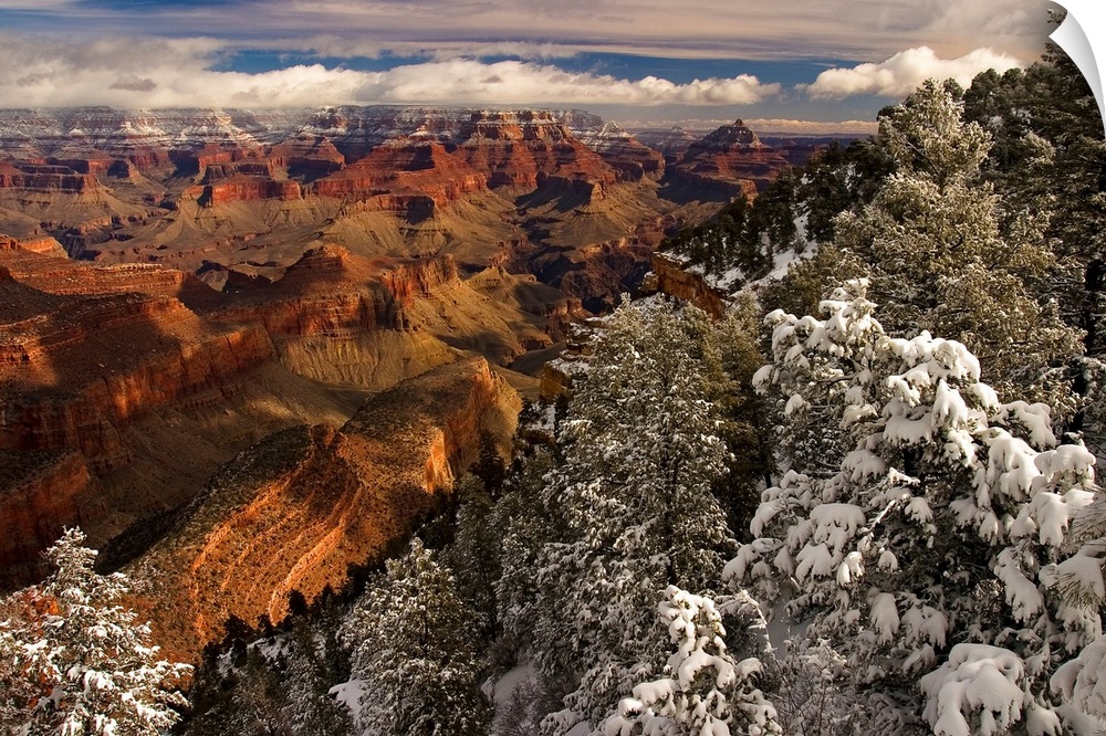 <p>From the National Geographic Collection. Photograph of snow covered forest with gorge in the distance fading into puffy white clouds.</p>