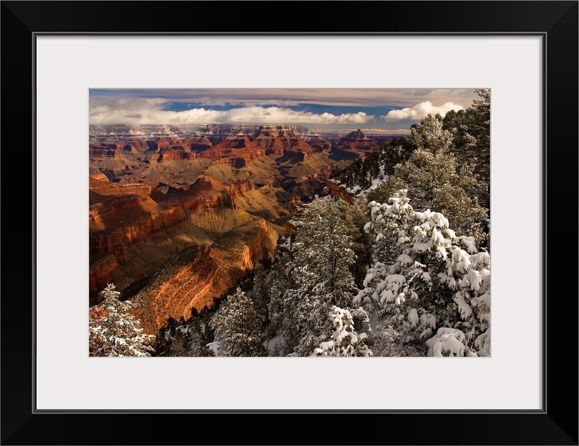 <p>From the National Geographic Collection. Photograph of snow covered forest with gorge in the distance fading into puffy white clouds.</p>