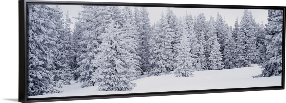 <p>A panoramic shot of a dense pine forest that is blanketed with snow.</p>