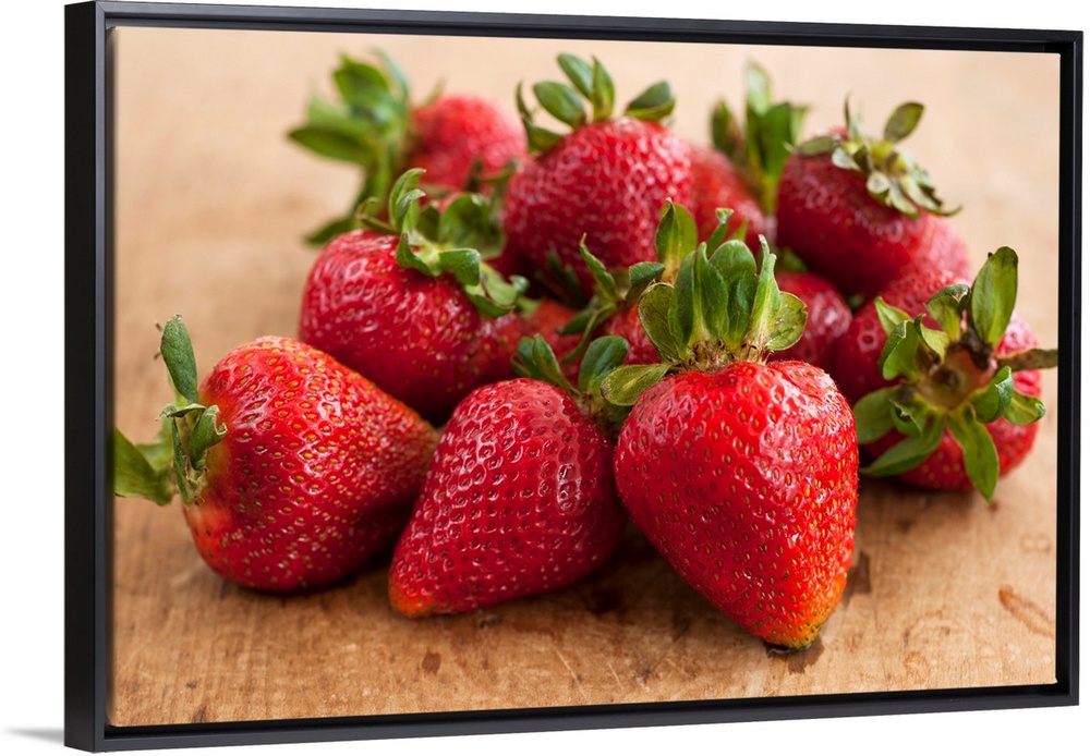 <p>Docor perfect for the kitchen of a batch of strawberries piled together on a wooden surface.</p>