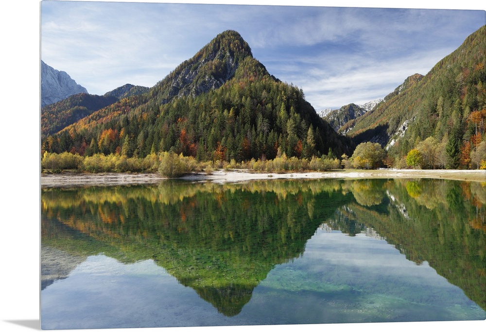<p>Julian Alps, Peaks of Prisojnik and Razor reflected in pools beside the Velika Pisnca river in autumn.</p>