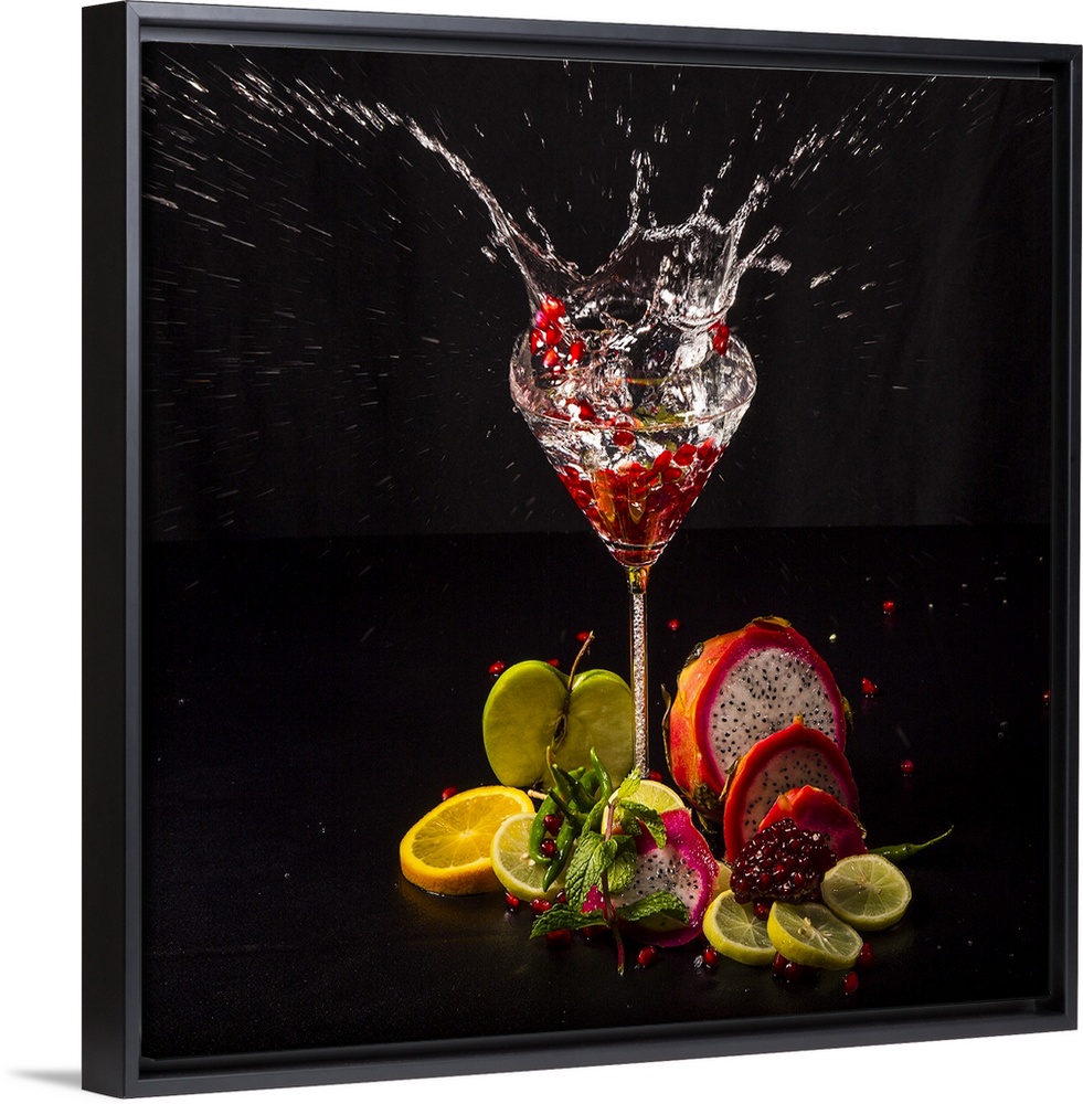 <p>Fruit splashing into a glass of liquid.</p>