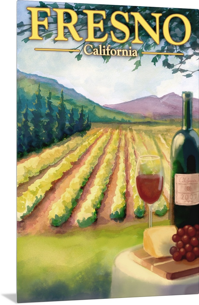 <p>Stylized art poster made to look like a watercolor painting of a vineyard at the foot of slow mountains with a plate of cheese, grapes, a glass, and bottle of wine in the foreground.</p>