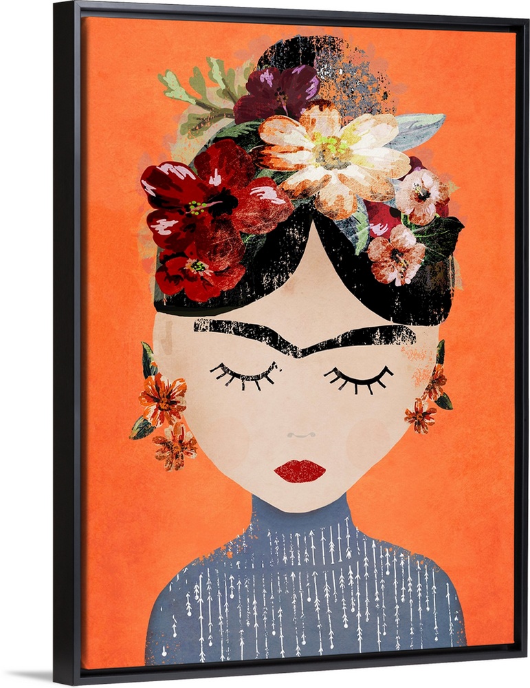 <p>A modern interpretation of the portrait of Frida Kahlo with her signature brows and eyes downcast. She wears a grey turtleneck sweater and flowers in her hair.</p>
