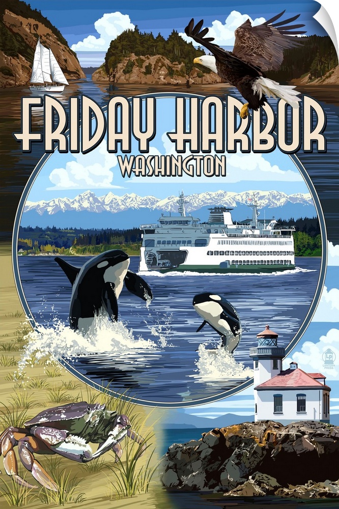 <p>Retro stylized art poster of a montage of different images, including whales, an eagle, and a lighthouse.</p>