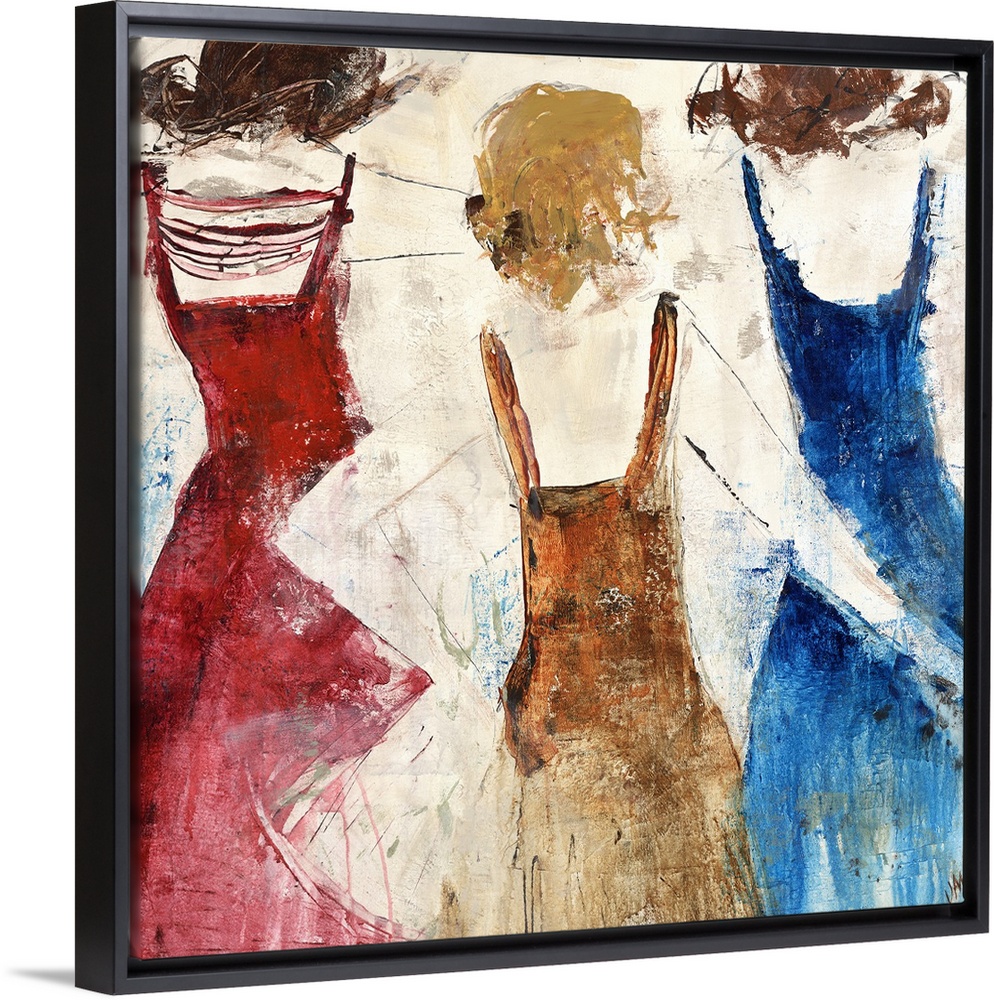 <p>Contemporary painting of three women in colorful dresses with backs facing viewer.</p>