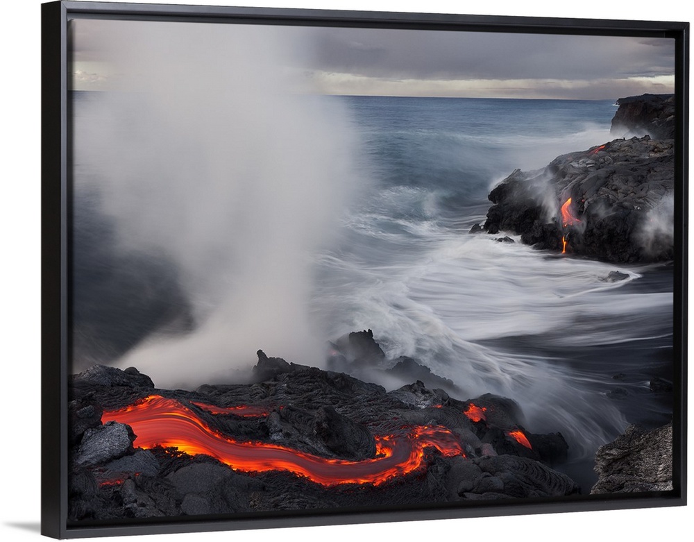 <p>Lava flowing into the ocean, creating large amounts of steam, Hawaii.</p>