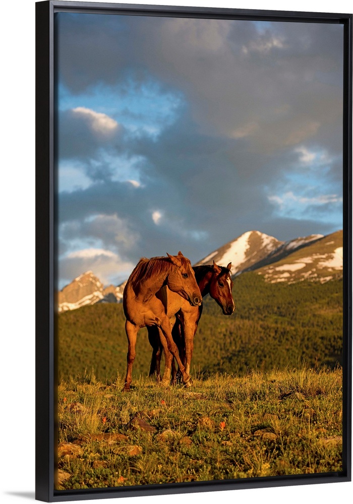 <p>Wildlife photograph of two horses in a field with mountains in the background at golden hour.</p>