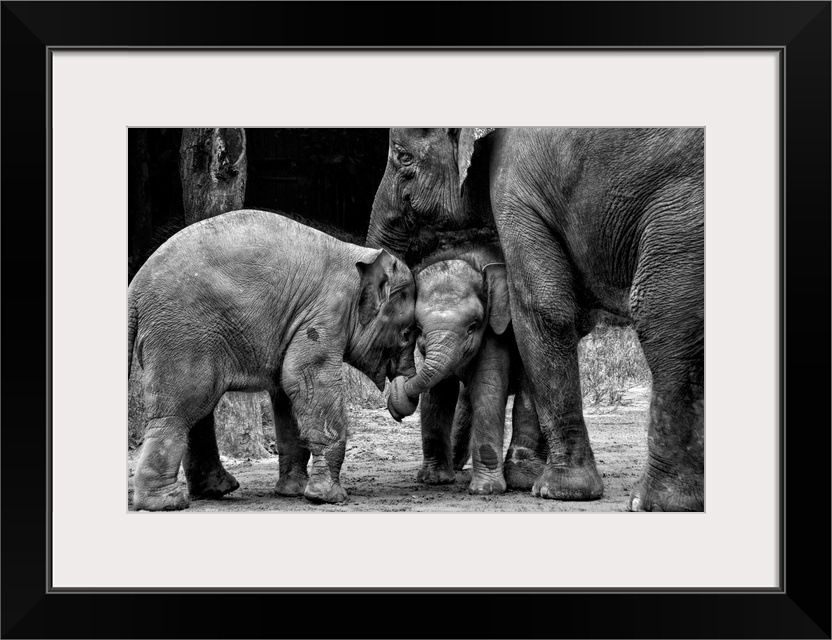 <p>Two young elephants lock trucks in a loving embrace of friendship.</p>
