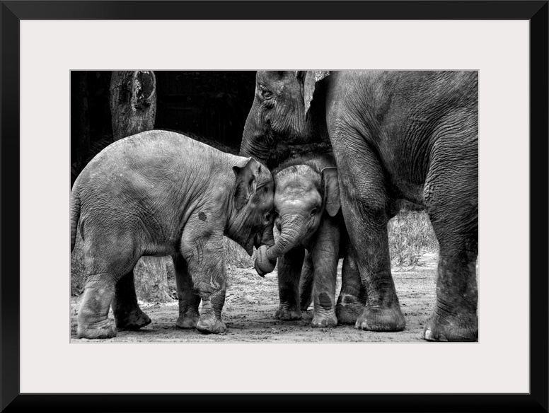 <p>Two young elephants lock trucks in a loving embrace of friendship.</p>