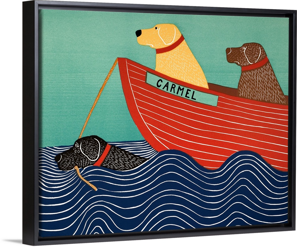 <p>Illustration of a black lab in the ocean pulling a yellow and chocolate lab in a red boat titled "Carmel"</p>