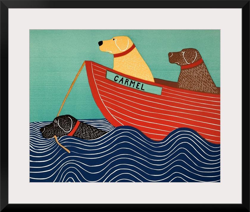 <p>Illustration of a black lab in the ocean pulling a yellow and chocolate lab in a red boat titled "Carmel"</p>