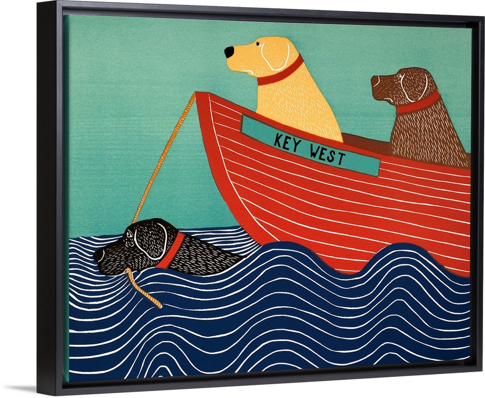 <p>Illustration of a black lab in the ocean pulling a yellow and chocolate lab in a red boat titled "Key West"</p>