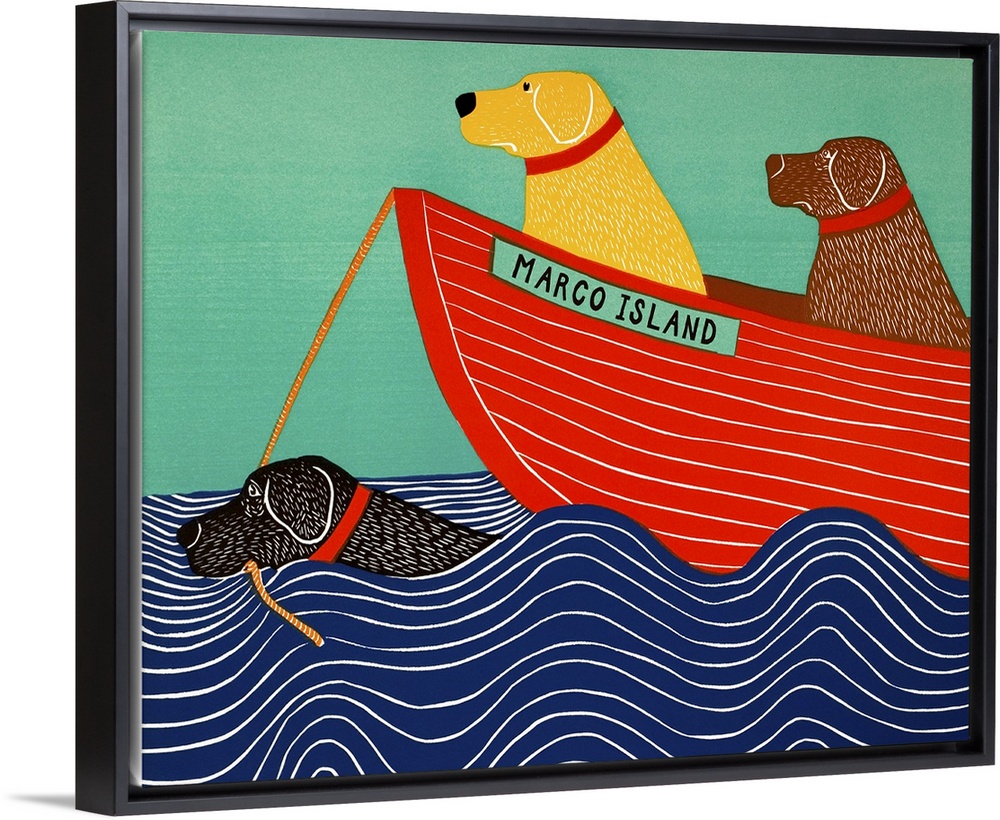 <p>Illustration of a black lab in the ocean pulling a yellow and chocolate lab in a red boat titled "Marco Island"</p>