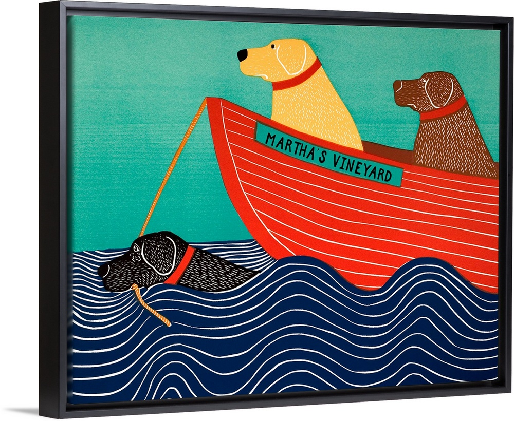 <p>Illustration of a black lab in the ocean pulling a yellow and chocolate lab in a red boat titled "Martha's Vineyard"</p>