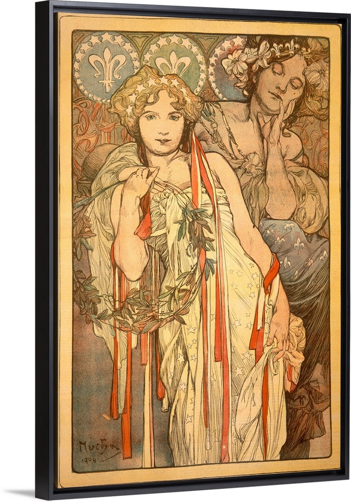 <p>Large, vertical vintage poster art of two women in flowing dresses with elaborate hair pieces. The woman in the foreground holds a wreath of branches and leaves and has long ribbons hanging down from her hair.</p>