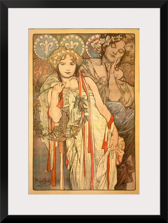 <p>Large, vertical vintage poster art of two women in flowing dresses with elaborate hair pieces. The woman in the foreground holds a wreath of branches and leaves and has long ribbons hanging down from her hair.</p>