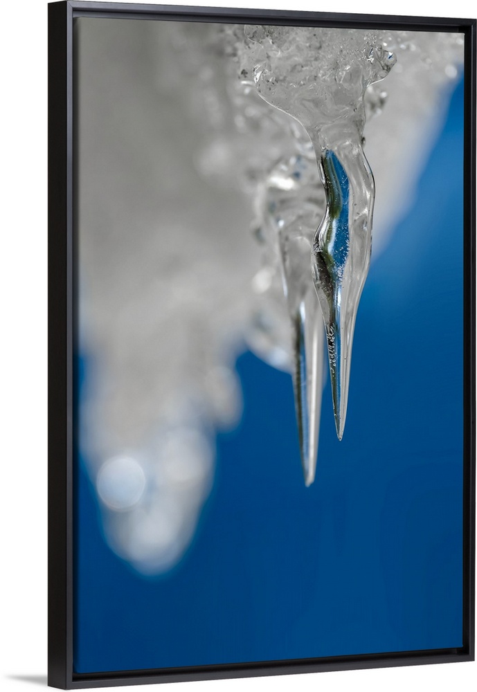 <p>Two icicles hanging from the roof of a shed, on a perfectly clear and blue Winter day. The icicle in front was kept in focus, while the rest of the scene is intentionally blurred to make the sharp icicle stand out. The icicle is reflecting the sky in a blue stripe. Ursula Abresch Winter Collection.</p>