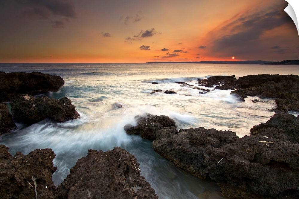 <p>Frog Rock, kenting at dusk with foaming waves rushing in and crashing on dark coral reefs while sky is painted red by setting sun; in Pingtung, Taiwan.</p>