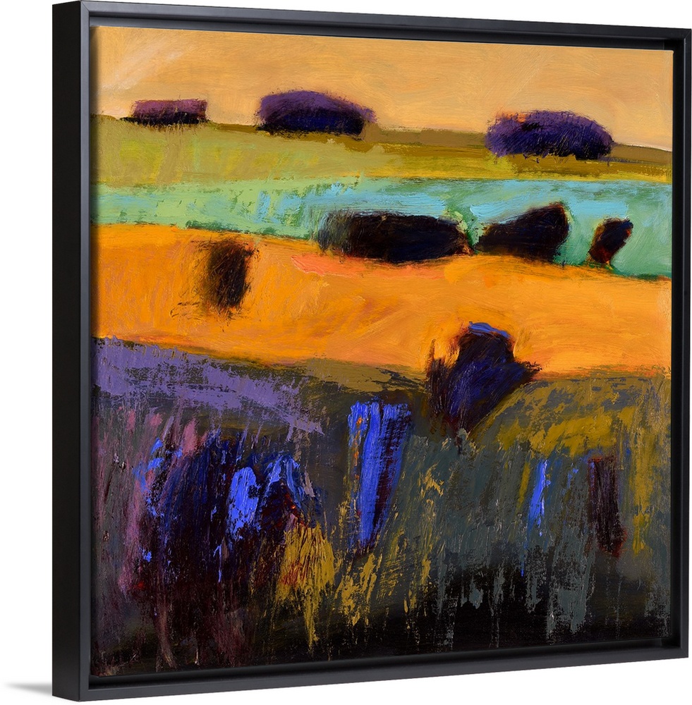 <p>A square abstract of a landscape of rolling hills painted in vibrant colors.</p>