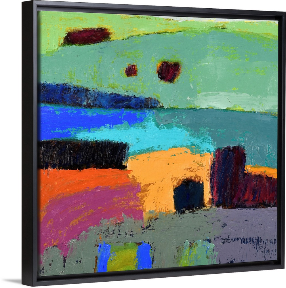 <p>A square abstract of a landscape of rolling hills painted in vibrant colors.</p>